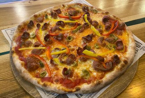Представляем вам настоящую мясную пиццу, которая покорит сердца всех мясоедов! Сочные ломтики колбасы, ароматный бекон и нежное мясо, щедро усыпанные расплавленным сыром, создают идеальное сочетание вкусов. Это настоящая находка для тех, кто ценит сытные и аппетитные блюда!