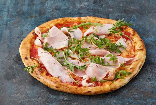 Моцарелла, красный соус, песто, тамбовский окорок, руккола